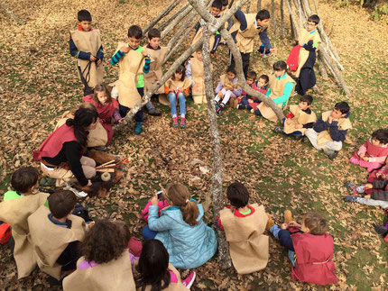 Para grupos de INFANTIL la excursión se desarrolla por un recorrido muy fácil de 1 km de distancia visitando un poblado de cabañas de tipo neolítico junto a un arroyo donde se realizan demostraciones participativas de tiro, pintura y fuego y la zona de bisontes y caballos salvajes.