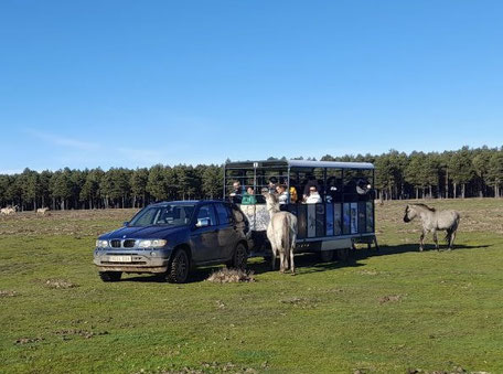 La visita en Jeep/Vagón es en grupo formando parte de una expedición en un todoterreno de 10 plazas o en vagón tipo tren de 25 plazas al más puro estilo de safari africano que le transportan durante un periodo de 130 minutos por recintos y campamento partiendo del centro de recepción.